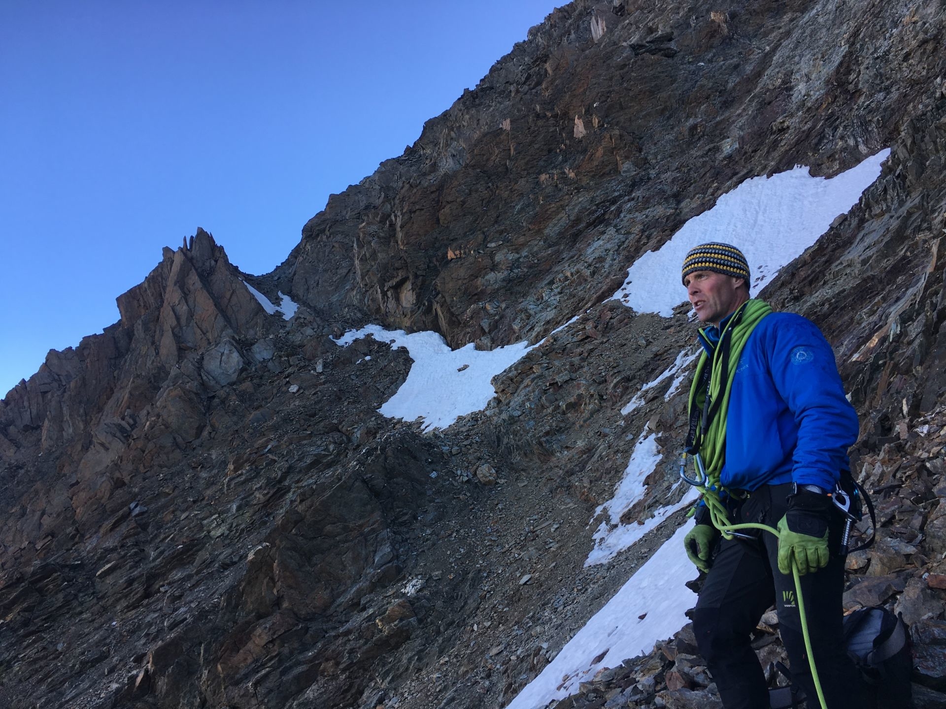Nun machen wir uns freudig an die Gratkletterei. Der Weg zum Hohbärghorn führt zunächst über einen Blockgrat, dann über Firn, und schliesslich über eine steile Felsstufe, die sich wunderbar erkraxeln lässt (I). Wenig später stehen wir auf dem ersten Viertausender des Tages. YES!