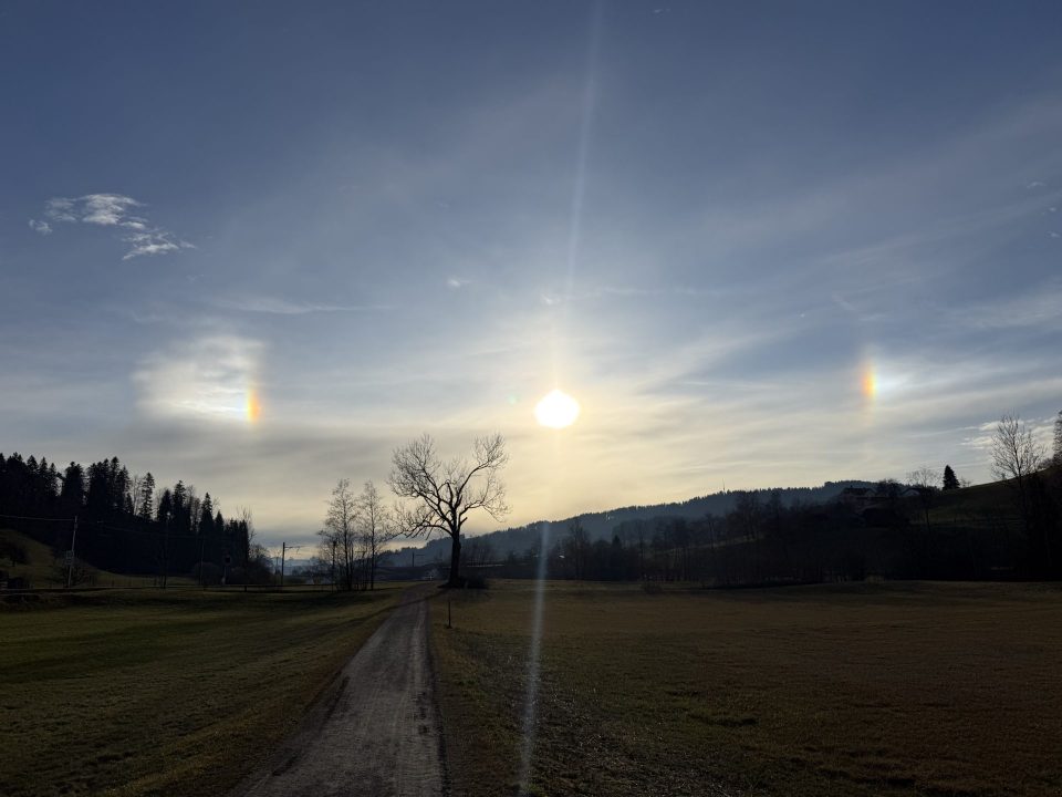 Der schmale Pfad über die Krete des Josenbergs gefällt. Vor allem jetzt, wenn die kahlen Äste der Bäume mit etwas Schnee bepudert sind und die Eiskristalle in der Sonne glitzern. Das letzte Wiesenstück zur Alp Scheidegg ist bei diesen Verhältnissen jedoch leider sumpfig und glitschig. Ich bin froh um meine Stöcke.