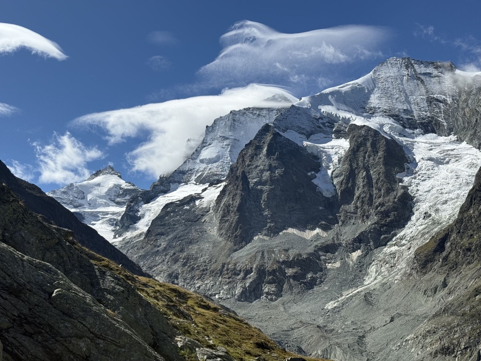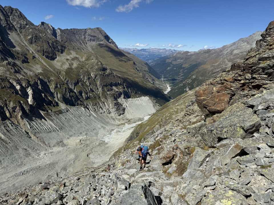 Später führt nun eine gut kettengesicherte Steilstufe weiter. Dann öffnet sich der Blick in die hinterste Geländekammer – und ich erlebe denselben „Wow“-Moment wie damals mit meinem Vater. Vor mir erheben sich Obergabelhorn, Trifthorn, Mont Durand, Zinalrothorn und Dent Blanche – eingerahmt von gewaltigen Eismassen. Eine Kathedrale aus Stein und Eis. Die Szenerie ist so überwältigend, dass mich ein tiefes Gefühl von Ehrfurcht und Demut erfasst. Ich atme tief durch, um dieses Bild in mir zu speichern.