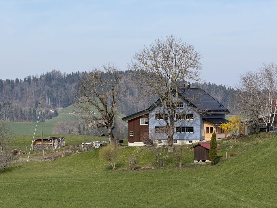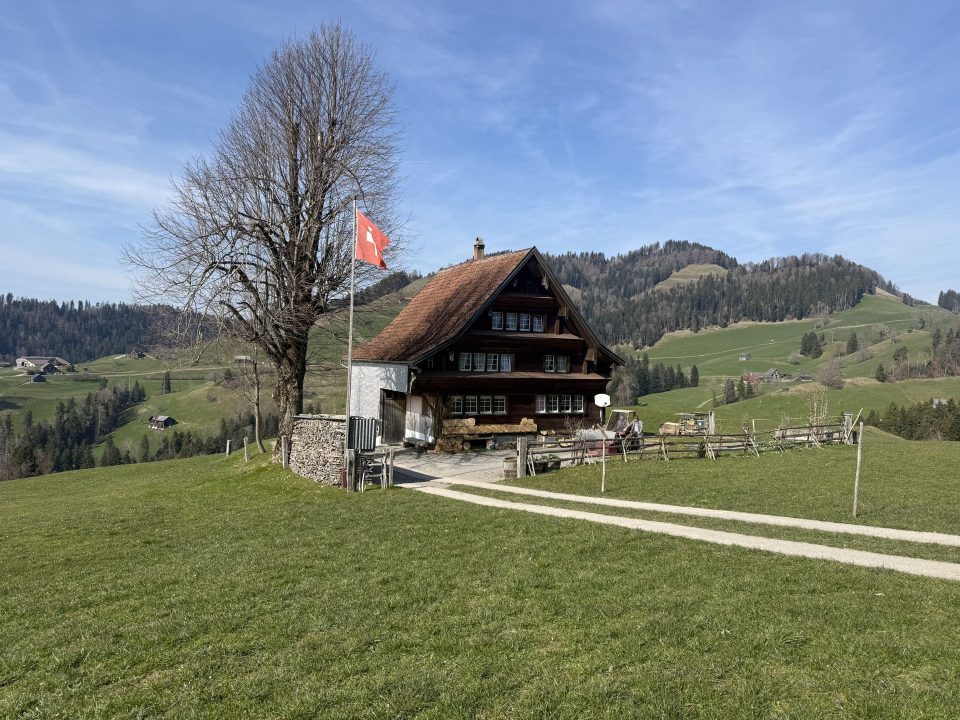 Von hier führt der Weg gemächlich südwärts. Die Appenzeller Kulturlandschaft zeigt sich von ihrer besten Seite: sorgfältig bewirtschaftete Hänge, dunkelbraune Holzhäuser mit charakteristischen Schindelfassaden, Kühe, die einen anschauen, als würde man sie stören — was man bisweilen auch tut, denn ein paar Höfe quert der Weg direkt.