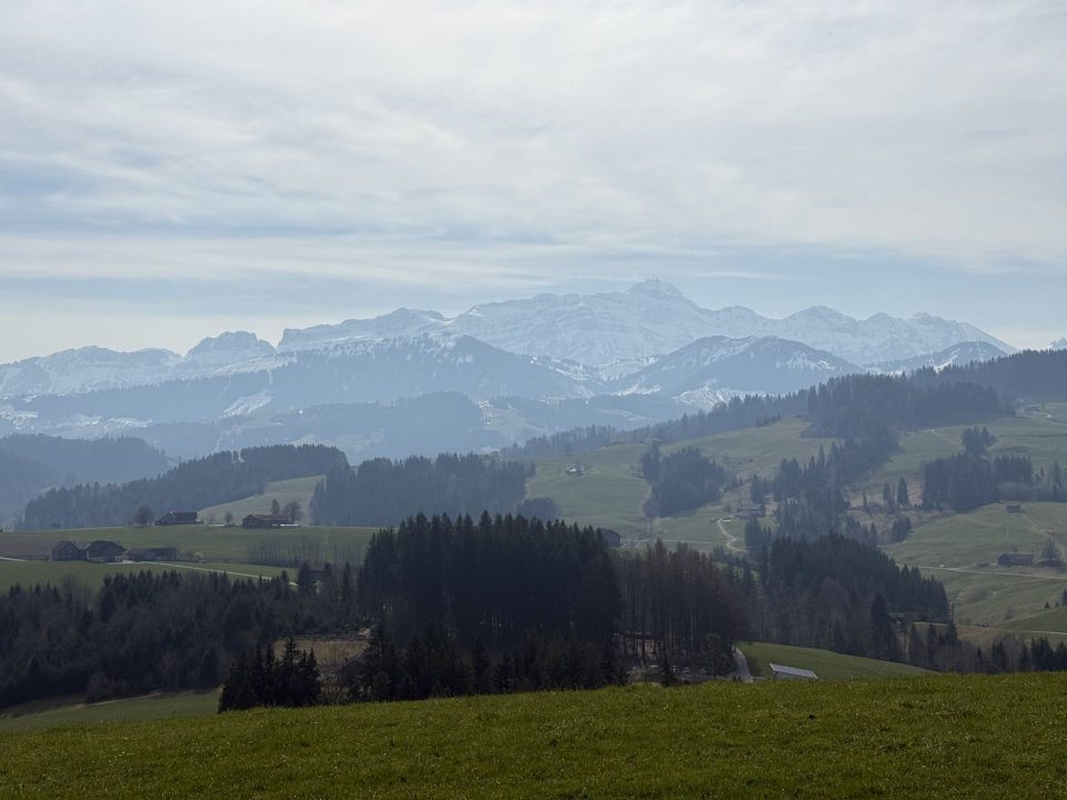 Der erste Aufstieg zum Nieschberg ist zügig, aber gut zu gehen. Das Motörchen surrt zufrieden. Ich grüsse die ersten Geissen am Wegrand. Oben öffnet sich der Blick trotz noch etwas milchigem Himmel: ein weites Panorama hinüber zum Säntismassiv und tief hinein ins Toggenburg. Der Säntis zeigt sich in frischem Weiss — einfach zum Anbeissen schön. Die sanfte Hügellandschaft darunter wirkt dadurch fast schwebend.