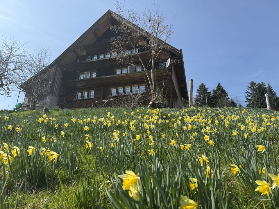 Von St. Peterzell sind es noch gut sieben Kilometer nach Wattwil. Der Weg steigt nochmals zünftig an — über Hofstetten, den Reitenberg und zum Scherrer — bevor er entlang einer Reihe von Toggenburger Bauernhöfen nach unten zieht. Neben dem Weg schiessen Buschwindröschen, Krokusse und die ersten Narzissen aus dem Boden. Romantisch, wirklich. Auf dem Scherrer ist auch das Berghotel Churfirsten geschlossen. Tant pis — dann eben weiter nach Wattwil.